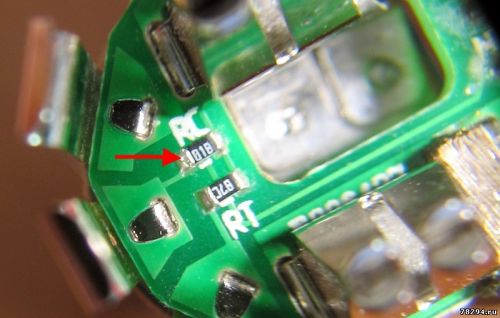 А цепочка уровня заряда в обрыве. Ну и хорошо. Выпаиваем резюк с маркировкой 01В. И припаиваем на его место SMD резистор номиналом в 1 Кило ом. Я взял 1206, его паять легче.