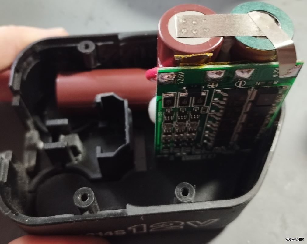 Я на 12 вольтовом аккумуляторе спилил все внутренности, к двум банкам, что идут в «нос» приклеил упор, на упор привинтил маленький саморез, для того, чтобы саморез удерживал приужину от падения. Таким образом получилось сделать 4s батарею. Но старая зарядка всё равно не подошла - выдавала 30 вместо положенных 18 ( 4.5 в на банку - не критично - это если бмс не будет срабатывать)