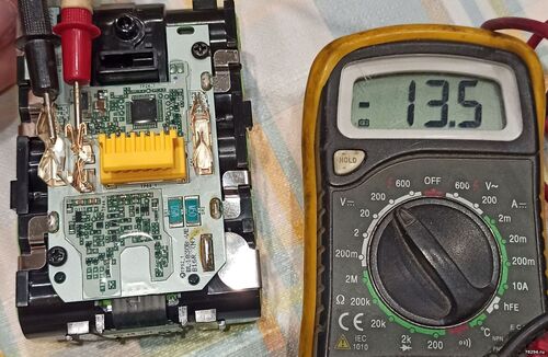 После того, как ее вставили в чужой инструмент (предположительно неисправный) батарея перестала нормально функционировать. Индикаторы показывают полный заряд и не моргают. Напряжение на всех ячейках присутствует и оно одинаковое. Но отсутствует напряжение на минусовой клемме батареи: