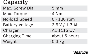 Schrauben-Ø bis : 5 mm Leerlaufdrehzahl : 180 min-1 Max. Drehmoment : 3 Nm Akkuspannung : 3,6 V Ladedauer : 5 h Bohrfutter : Magnetischer Bithalter mit Sechskantaufnahme Maschinengewicht : 0,30 kg