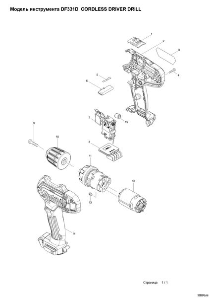Артикул Детали Описание Замена Количество 001 126233-0 SPEED CHANGE LEVER ASSEMBLY 1 C10 231433-0 COMPRESSION SPRING 4 2 002 183B50-3 HOUSING SET 1 C10 252126-6 HEX. LOCKING NUT M4-7 2 D10 INC. 14 003 851H36-8 DF331D NAME PLATE 1 004 266429-2 TAPPING SCREW 3X16 9 005 232239-9 LEAF SPRING 1 006 456039-5 F/R CHANGE LEVER 1 007 632F42-8 SWITCH UNIT 1 * C10 620463-0 LED CIRCUIT 1 * C20 632F65-6 LINE FILTER UNIT 1 * 007-1 632J76-5 SWITCH UNIT < 1 C10 620625-0 LED CIRCUIT 1 C20 632F65-6 LINE FILTER UNIT 1 008 644813-5 TERMINAL 1 009 251451-2 - PAN HEAD SCREW M5X22 1 010 763228-8 KEYLESS DRILL CHUCK 10 1 011 123503-8 GEAR ASS'Y 1 012 629169-7 DC MOTOR 1 013 911003-8 PAN HEAD SCREW M3X6 2 014 183B50-3 HOUSING SET 1 C10 252126-6 HEX. LOCKING NUT M4-7 2 D10 INC. 2 015 688164-6 LINE FILTER 1 A01 251314-2 + SCREW M4X12 1 A02 346909-5 HOOK 1 A03 784244-7 + BIT 2-50 1 A04 456128-6 BATTERY COVER 1 A05 ***DC10WC DC10WC BATTERY CHARGER 1 D10 COMPO-PARTS A06A 197394-3 BATTERY BL1020B SET 2 A06B 197402-0 BATTERY BL1040B SET 2 A06D 197390-1 BATTERY BL1015 SET 2 A07 821661-1 PLASTIC CARRYING CASE 1 C10 417724-5 LATCH 2