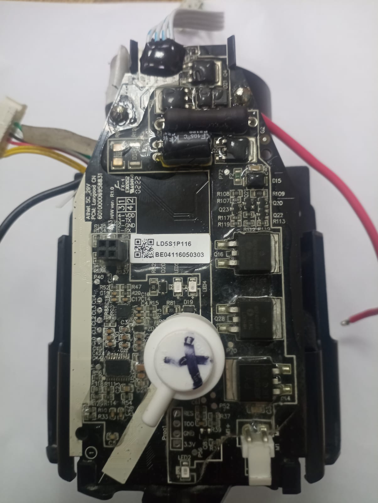 Отследить цепочку включения зарядки. Посмотреть, что ее включает. Прозвонить элементы. Обычно, если блокируется плата, то не работает ни мотор, ни зарядка. В Вашем случае мотор включается. Есть вариант отпаять все провода с акк, и опять подключить в последовательности: - , промежуточные по нарастанию, ....., + Не работает, попробовать наоборот: +, пром..., - Тут проблема - не опознан МК, без маркировки. К нему бы подключиться попробовать