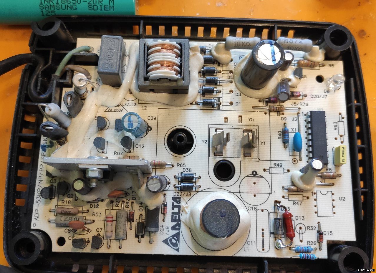 Перебрал в родном зу все, до чего добрался, нашел пару подсохших емкостей, поменял, не помогло. Плюнул, купил на авито DELTA ADP-53AP, напряжение в стоке 52,5В, индикация нормальная, все ок. Поменял d23 на 1.5ке18а, только такие остались, все остальное на прошлом зу посжигал, результат: супрессор раскаляется и сгорает за несколько секунд, напряжение на выходе около 2В показывает, индикация чудит, показывает заряд. Вернул родной диод, все ок. Не верится в 2 разных одинаково сломанных зу, скорее в то, что я что-то не так делаю.