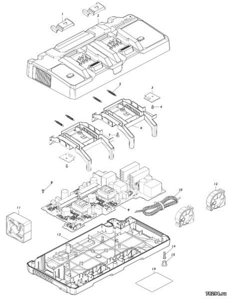 Pos. Parts no. Description 1 412892-9 Terminal cover 2 140Y57-0 Charger case complete C10 412893-7 Lens C20 8024W4-1 Charging condition label 1 C30 8024W5-9 Charging condition label 2 3 620E51-3 LED circuit 4 266764-8 Pan head tapping screw 3X8 5 232647-4 Tension spring 4 6 412891-1 Terminal base 7 266278-7 Flange tapping screw 3X10 8 266764-8 Pan head tapping screw 3X8 9 620E50-5 Charging circuit C10 647306-1 Varistor C20 652094-7 Fuse 10 667705-1 Power supply cord 10 667709-3 Power supply cord 11 632R81-0 Fan 60 12 632R80-2 Sirocco fan 13 412890-3 Charger case cover 14 266426-8 Pan head tapping screw 4X20 15 286255-3 Cap 13 19 811G31-4 Name plate DC40RB F01 191N07-2 Two port multi fast charger set DC40RB F01 191N14-5 Two port multi fast charger set DC40RB