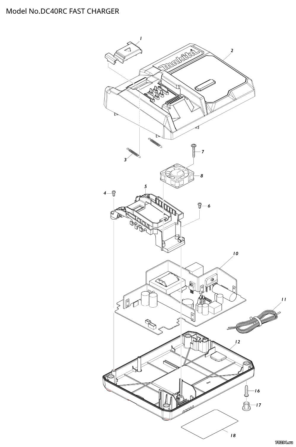Pos. Parts no. Description 1 459475-4 Terminal cover 2 140Y70-8 Charger case complete C10 459476-2 Lens C20 8025H8-4 Charging condition label 3 232565-6 Tension spring 4 4 265B02-7 Pan head tapping screw 3X8 5 413184-9 Terminal base 6 265B02-7 Pan head tapping screw 3X8 7 265A61-5 Flange tapping screw 3X25 8 632P24-0 Fan 40 10 620E59-7 Charging circuit C10 647321-5 Varistor C20 652071-9 Fuse 10 620E60-2 Charging circuit C10 647306-1 Varistor C20 652804-2 Fuse 11 667805-7 Power supply cord 11 667986-7 Vinyl cord 0.75-2-2.0 12 413183-1 Charger case cover 16 265B01-9 Pan head tapping screw 4X20 17 286255-3 Cap 13 18 811B67-3 Name plate DC40RC F01 191M89-8 Fast charger set DC40RC F01 191M92-9 Fast charger set DC40RC
