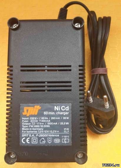 Тип устройства: SPIT 60 мин. Быстрая зарядка? 60 мин. Быстрое зарядное устройство Производитель: SPIT S.A., F-26000 Valence, Франция Изготовлено для SPIT в: Германии Модель: CU 65 Тип: FW 1999 / 15.0099 Вход: 220/230 В - 260 мА -38 Вт - 50/60 Гц Выход: 7,2 - 17 В постоянного тока - 1500 мА - 25,5 ВА IP: 20 кл.Ф Размеры: ДхШхВ = 145х80х80 мм Вес: 1.401 кг