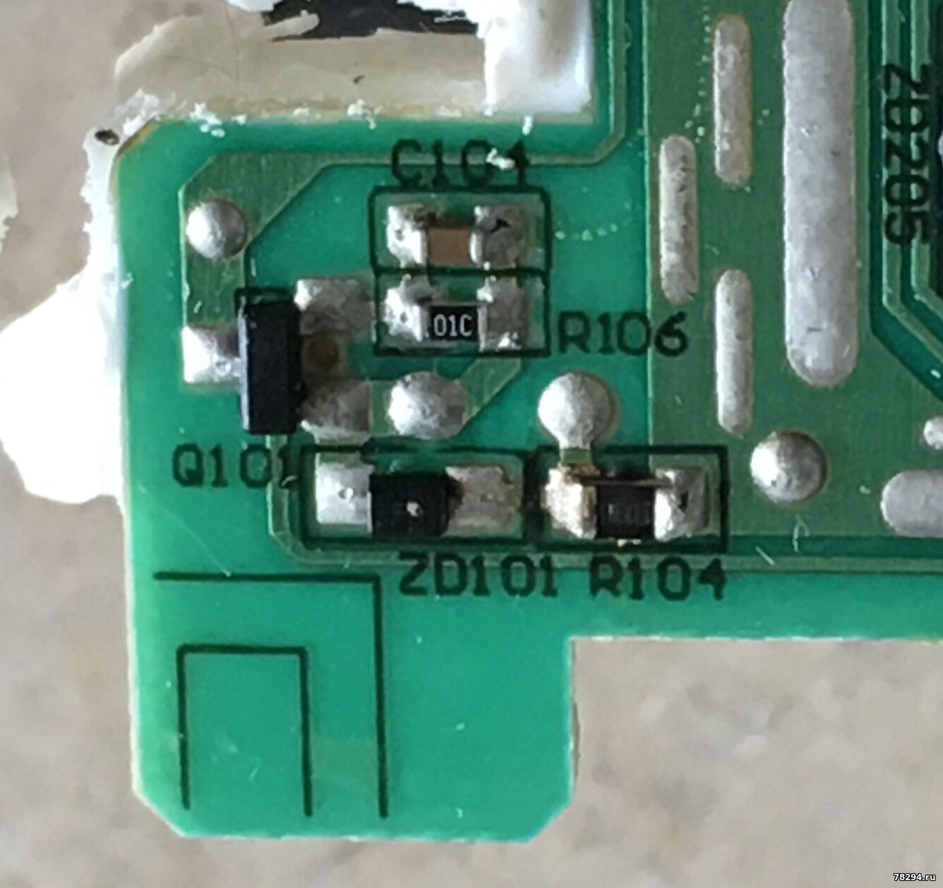 Не первый раз попадаются платы 1106 со сгоревшими q101, zd101 и r104. И как правило, зарядное при этом работает.